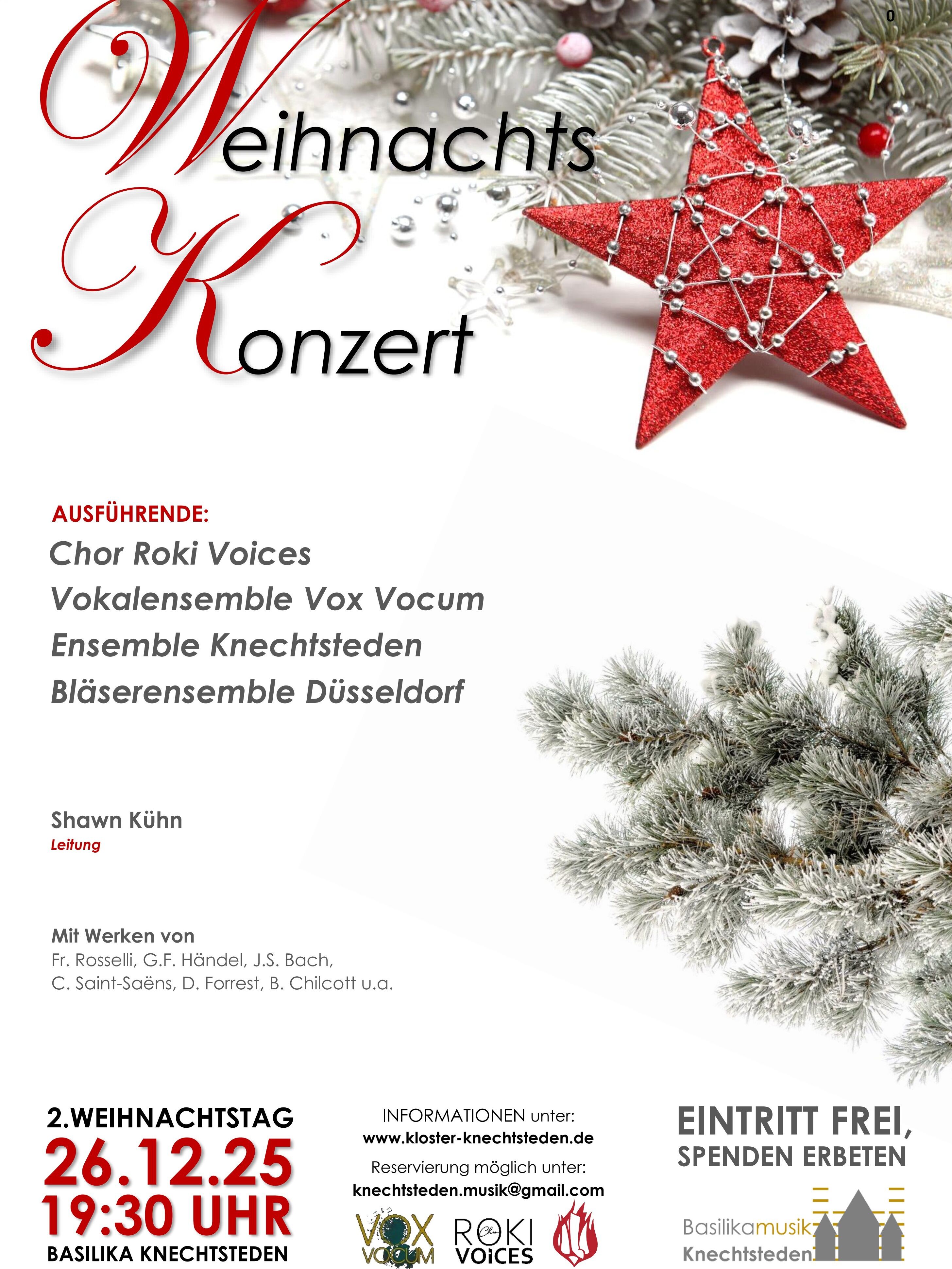 Erleben Sie das Große Weihnachtskonzert der Basilika Knechtsteden. Die Roki Voices werden zum ersten Mal mitgestalten und es neben uns auch noch das Vokalensemble Vox Vocum, das Ensemble Knechtsteden und viele weitere Solisten zu hören.
